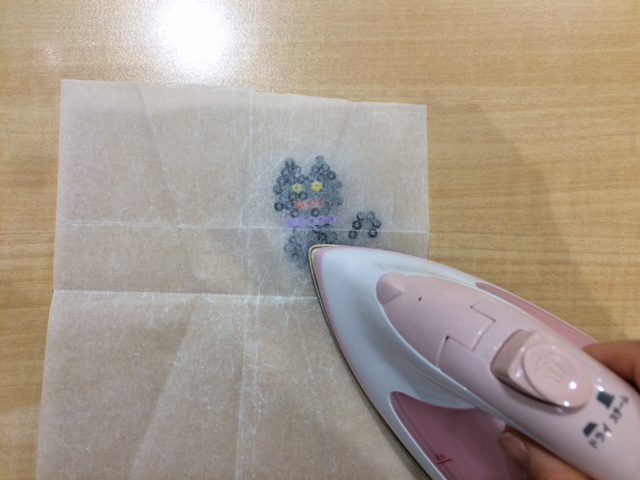 ②ビーズの上にアイロンペーパーをのせ、中温にあたためたアイロンで「の」の字を書くようにあたためる