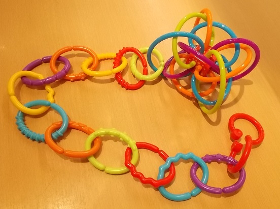 更に長く繋げると、ベビーカーやチャイルドシートにあそび道具を繋げるチェーンとしても活躍します!