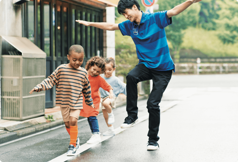 縁石や白線の上を落ちないように歩ける? 片足跳びに、次は忍者歩き! 「走る」「跳ぶ」「登る」