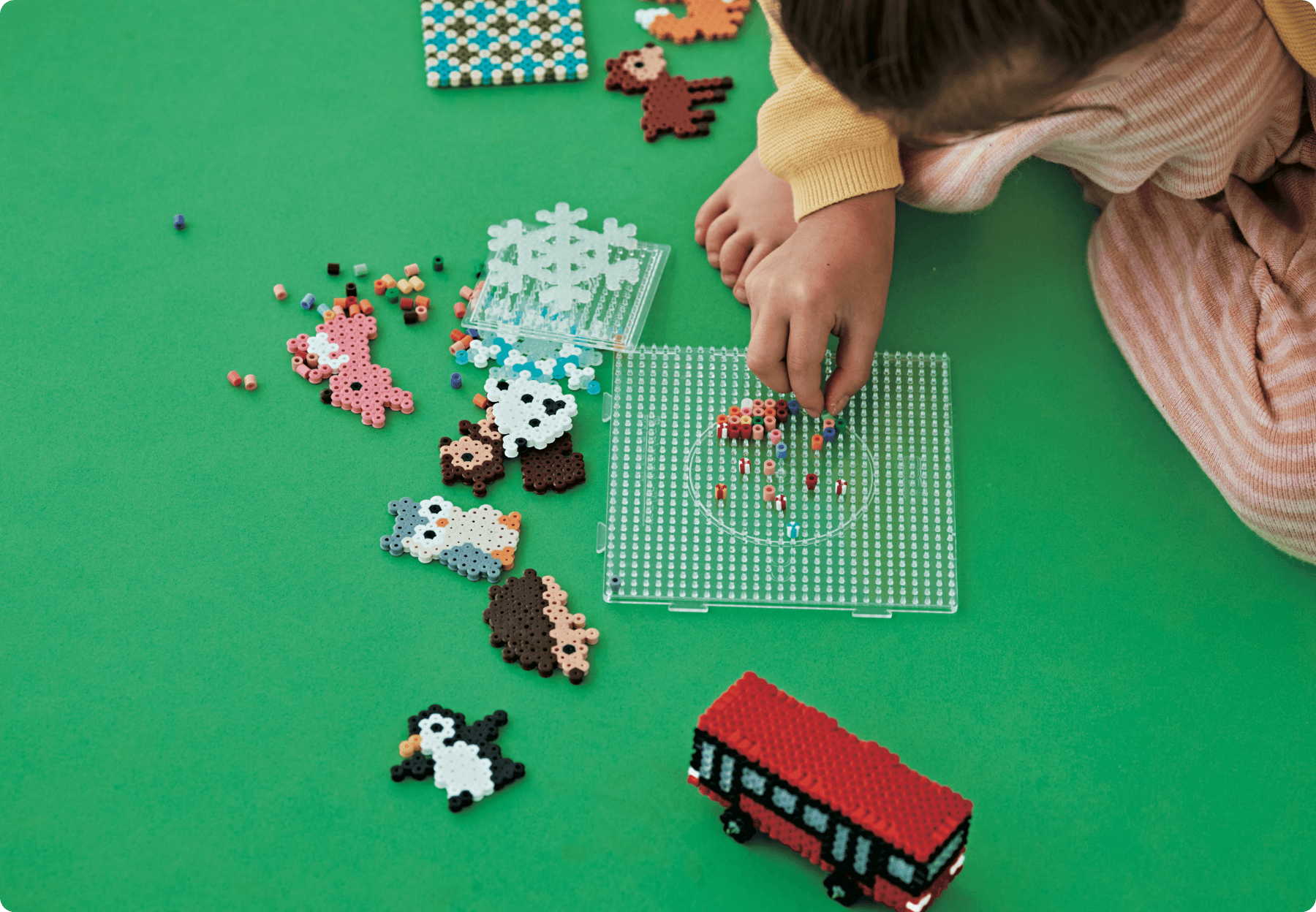 創作の表現手段は、絵の具やクレヨンだけではありません。1961年にデンマークで生まれたマルタハニング社のアイロンビーズ「ハマビーズ」は、想像力をかき立てる豊かな色バリエーションと、ビーズの精巧さが特徴です。好きな色のビーズを並べてアイロンペーパーの上からアイロンをかけると、熱でビーズが溶けてくっつき、オリジナル作品が完成します。平面から立体作品まで、好みによって自分らしい遊び方を見つけられるので、子どもから大人まで、世界中に愛好者が。好きなものを思い思いに表現し、形にする喜びを誰もが味わえます。
