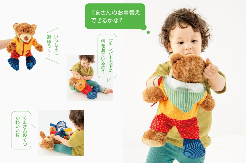 身のまわりのことを自分でやりたいという意欲が出始める頃に。あそびを通して手や指を動かし、ボタンやファスナーの開け閉めができるようになります。また、くまさんでパペット遊びをすれば、親子のコミュニケーションにも。