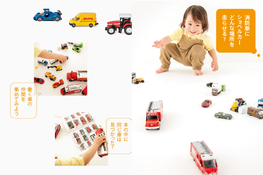 車図鑑で同じ車を探してみたり、色ごとに分けたり、仲間分けをしたり……。ママやパパの声がけであそびを広げましょう。いろいろな人がさまざまな仕事をして働いていることを、車を通して説明することで、社会の仕組みを知るきっかけにもなります。