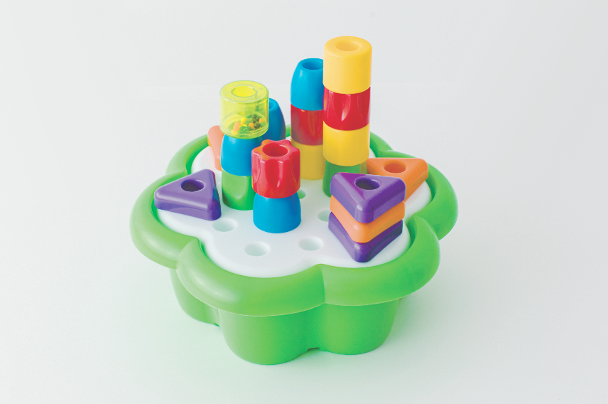 バケツの蓋のへこみに、ブロックの突起をはめるあそび。簡単にはまって積むこともできる楽しさが、繰り返し遊ぶ意欲をかき立てます。透明のブロックは心地良い音の出るビーズ入り。