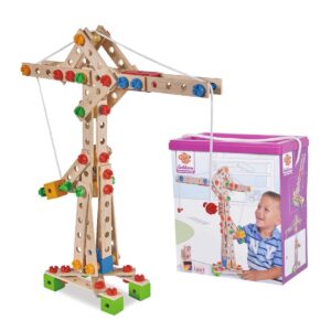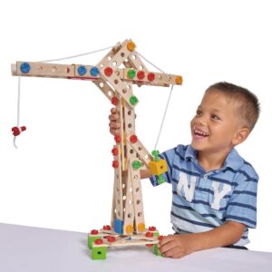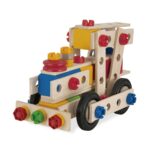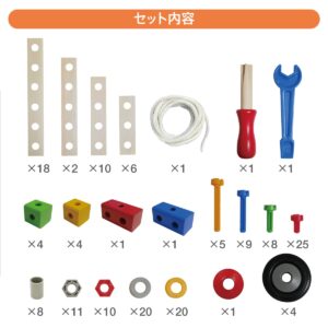 木製ブロックとネジやワッシャー、プレートとプラスチックパーツを組み合わせ、ネジ遊びや作品づくりが楽しめます。