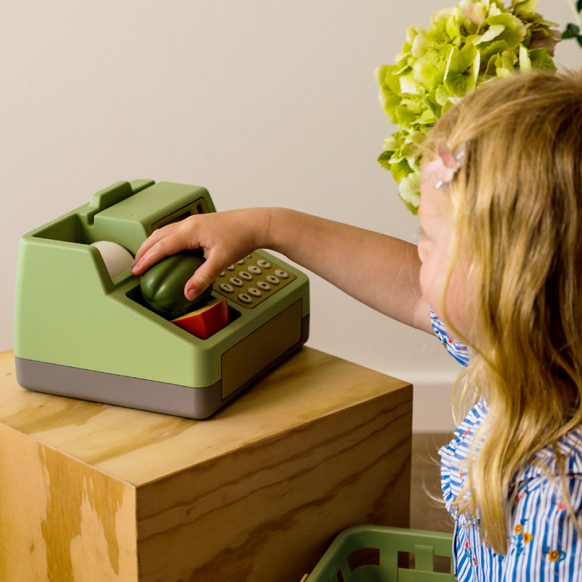 お金を入れる引き出しもOPENボタンでガシャンと開きます。お札やレシートも付属しており、「これください」「〇〇円です」「おつりをどうぞ」など毎日見るやりとりを再現できます。ことばがなめらかになり、何人かでひとつの世界観に入ってあそぶことができるようになる時期のため、「今日は何のお店にする?」と日替わりであそびの舞台を変えてみても。