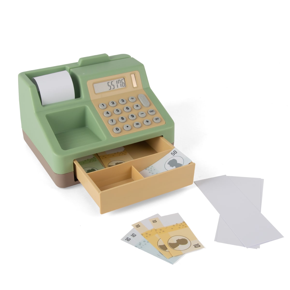 計算機付きのキャッシュレジスターはリアルで、思わずボタンを押してみたくなるデザイン。