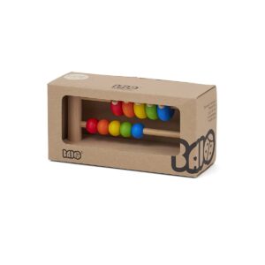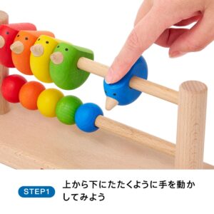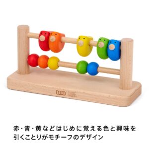 指先で、ちょんと触れると、くちばしで水を飲むかの様にくるんと回り、繰り返し手を動かしたくなる、ことりのアバカス。赤・青・黄などはじめに覚える色の組み合わせと、具体的な鳥の形で、6ッカ月頃からでも興味をひきやすい工夫がされています。最初は上から下に叩くように手を動かし、くるんと回る動きを楽しみにします。次に「つまむ」、「意識的に離す」動作を繰り返すうちに、目と手の協応が育まれます。下段の丸いビーズは、左右に動かすことを発見し…段階的に手の動かし方を覚えることが出来ます。手を動かしながら「あか」「いち」と色や数を口に出す事で、名前と意味が自然と結び付いていきます。