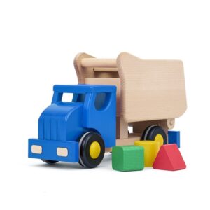 積み木ブロックをポトンと落とす、ぶ~んと家中を走らせる、荷台から荷物を下ろすを、何度もくりかえし、言葉を広げながら楽しむことができます。木のぬくもりを大切に金具を使わず、一部に塗装せずに木肌を残しているのは、バヨ 社ならではのこだわり。時間とともに変化する色や手ざわりを、子ども自身が感じられるように工夫されています。