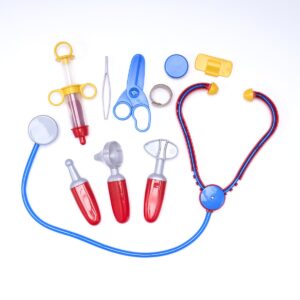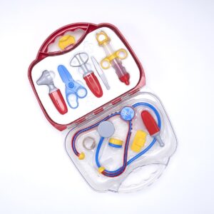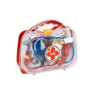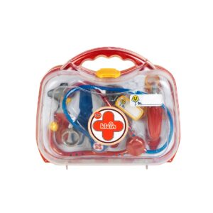 聴診器や注射器など、お医者さんの必需品が全て揃っています。注射器は中に赤いスポンジが入っているので、動かすと採血をしているように見えます!他にも自分の名前を書くことのできるお医者さんのネームバッジなど、子どもたちが実際の使い方を真似しやすい小物ばかりです。また、フタが透明なので中身がわかりやすいデザインです。