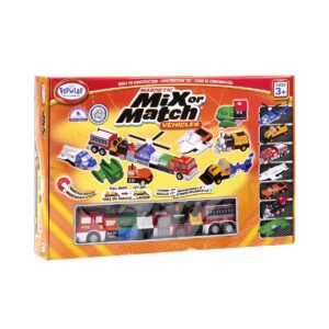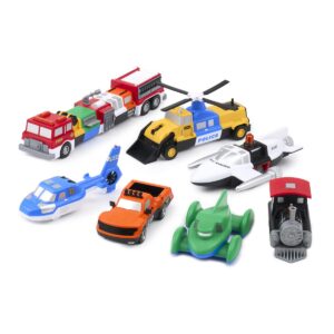 磁石の力で簡単につけたり外したりできるボディを自由に組み合わせ、頭の中に思い描いた想像の乗り物が完成する「ミックス&マッチシリーズ」のデラックス版。消防車・スペースレンジャー・ピックアップトラック・ポリスヘリコプター・蒸気機関車・スピードレーサー・ホイールローダーと働きが異なる7種の乗り物がセットになっています。車が大好きなお子様にぴったりのセットです。