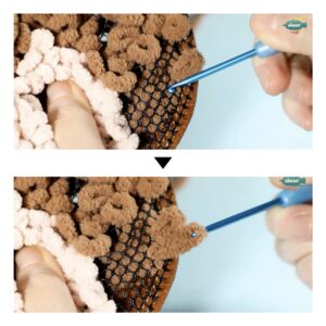 くま・うさぎのかたちのフェルトにはメッシュの下地がついていて、専用ツールで毛糸をひっぱるだけで、ふんわりループのテクスチャーが完成。