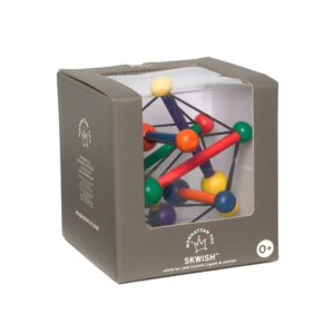 「テンセグリティ構造」=木の棒とゴムのひっぱり合う力でバランスを保ち、小さな手でも握りやすいデザインと、どこから力を加えてもつぶれ、元に戻る様子が赤ちゃんの好奇心をくすぐります。