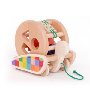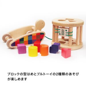 “カタッコトッ”と木と木が触れ合う音、ブロックが動く様子など、美しいモザイク模様が入った台車にのせて、見て・聞いて・動かして。