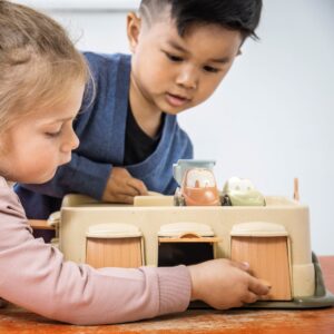 スピードを出し坂を下る、扉を開けて出し入れする、駐車場に何台も車を並べるなど、何度もくり返すのが楽しい時期の欲求に応えるあそびの機能がたくさん。