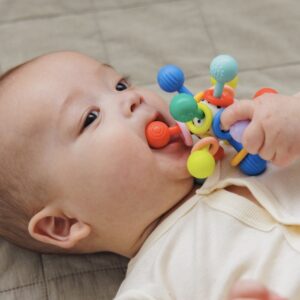 1歳ごろまでの手指の発達にあわせて長く遊べる、手遊びトーイ「スクィッシュ」は、アメリカ・マンハッタントーイ社のロングセラー。