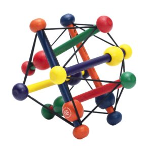 「テンセグリティ構造」=木の棒とゴムのひっぱり合う力でバランスを保ち、小さな手でも握りやすいデザインと、どこから力を加えてもつぶれ、元に戻る様子が赤ちゃんの好奇心をくすぐります。