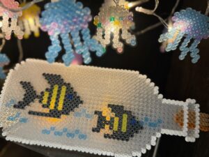 クリアカラーで作品を作ってライトで照らすといつもと違うハマビーズ作品が楽しめます。