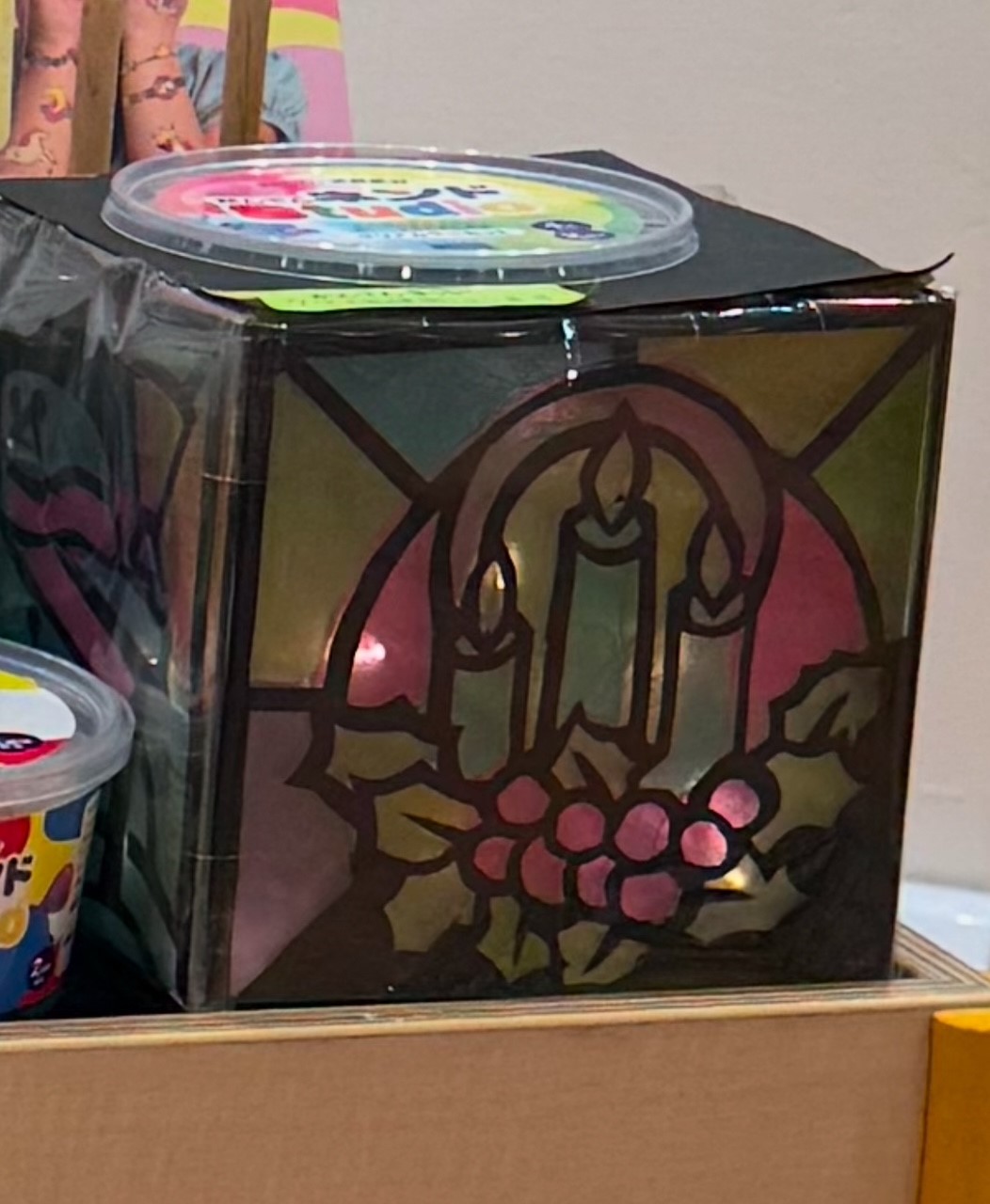 紙製フレームに作品を入れ、内側から削った透明部分にLEDライト(電池別売)をステッカーで貼ると、光をとおしステンドグラスのようになります。