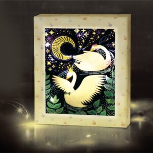 紙製フレームに作品を入れ、内側から削った透明部分にLEDライト(電池別売)をステッカーで貼ると、