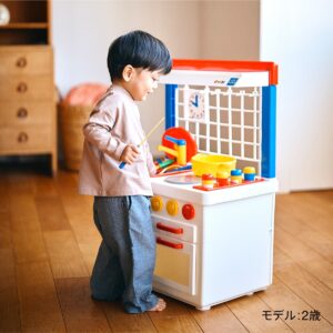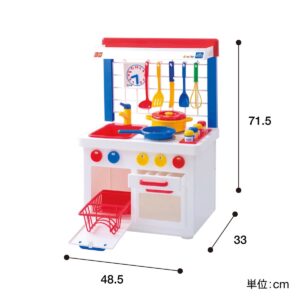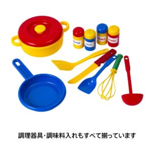 遊べる子どもの等身大サイズで、お料理に必要なお鍋、フライパン、調味料入れなど、すべてセットに。