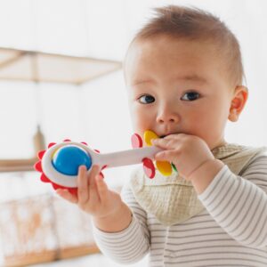 赤ちゃんの手指の発達に応じて、これ一つで、握る・振る・つまむ・まわすとさまざまな手の動きを促すラトルです。