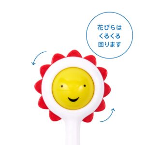 ひまわりのにっこり笑顔を回して「いないいないばあ」遊びや、大人が振ってシャカシャカと赤ちゃんをあやす道具にもぴったり。