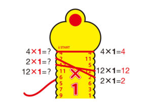 ②左の列の数字に、真中の数字を足した答えを右の列から探し、紐を引っ掛けます