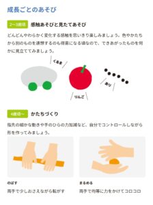 はじめは、こねる・伸ばす・丸めるなど手指を使って感触遊びを楽しみ、色と色を混ぜて新しい色を作ったり、想像した形をつくったり、成長ごとのあそびが広がります。