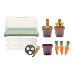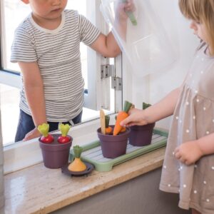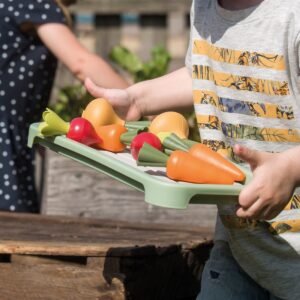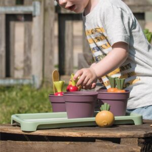 野菜を育てて収穫し、それを料理する、という流れを楽しめるプランティングセット。たまねぎは1個、ラディッシュは2個、にんじんは3本、と名前と数を覚えながら、野菜に親しむことができます。 公園やお庭、ベランダに持ち出して、土や水、花や葉っぱなど、自然の中で見つけた素材と組み合わせるのも楽しいあそび道具。水をかけて太陽の光を浴びさせ、大きくなれと語りかけたり、土の中から抜いて水できれいに洗ったり。いつもは室内でしている遊びも、場所を変えることで遊び方も楽しく変化します。 汚れても丸洗いできる点や、優れた耐久性も外あそびに適したポイントです。