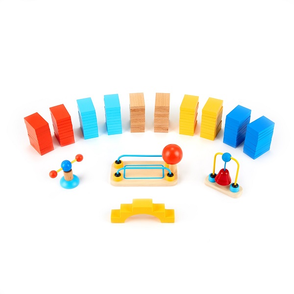 長方形の木製ピースを使って、並べたり積み上げたり、何通りものあそびが楽しめるドミノ。