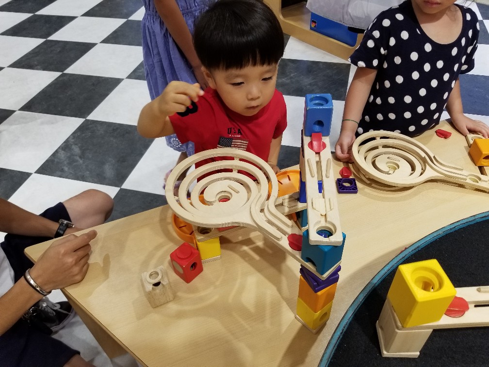 お手本をまねっこしながら自分で作ってもらいます。一段だけのコースでも、自分で作ったコースからビー玉が出てくるととっても嬉しそうです♪