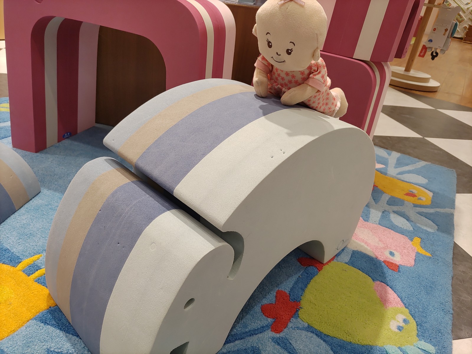 ゾウやドーナッツのくぼみに寝かせてあげて、大人の方が揺らしてあげてください。優しく揺らしながらお歌をうたってあげたりすると、赤ちゃんもごきげんに♪