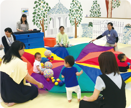 親子のスキンシップを大切にした、うたあそび、パペットあそび、ボールあそびなどを通じて、毎回異なる発達テーマを学びます。ボーネルンドの「あそび道具」を使い、ボーネルンドデザインの「あそび環境」で、赤ちゃんは「こころ・頭・からだ」の発達がバランスよく促され、親は発達や子育てについての理解が深まります。