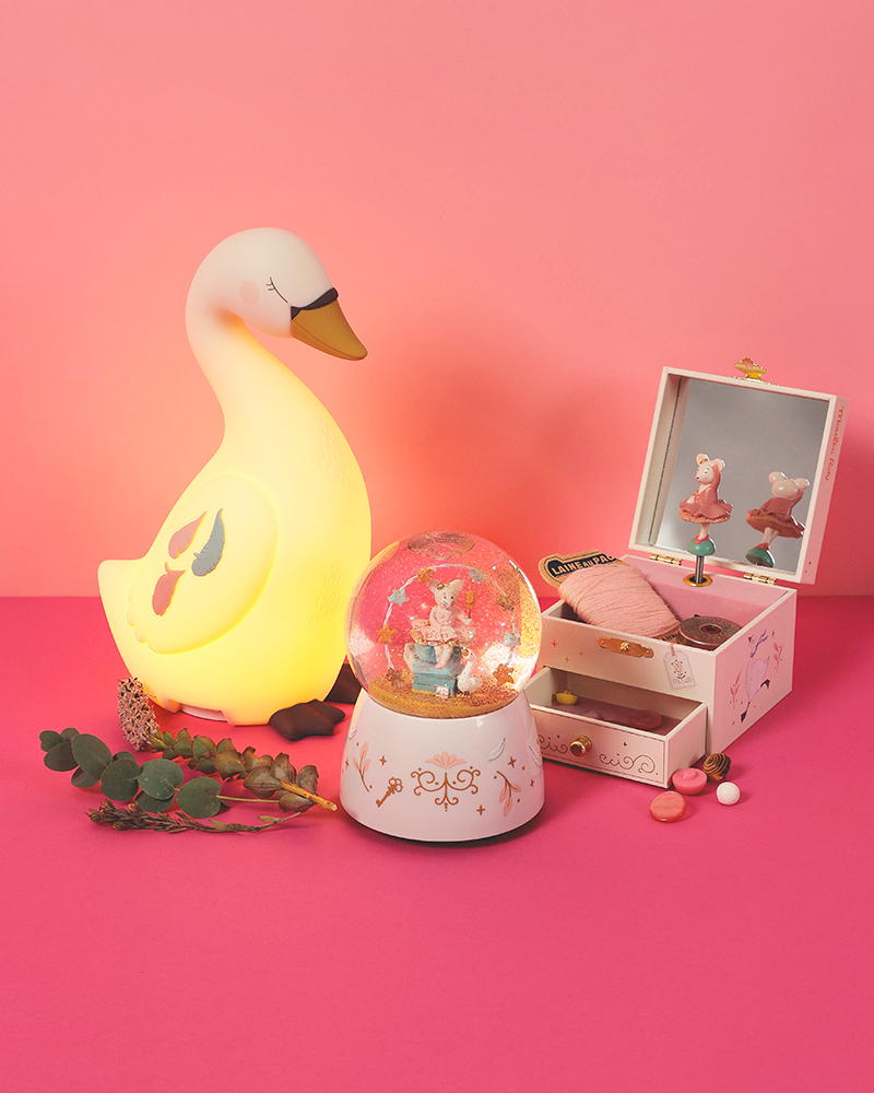 明るさ調整可能なベビールームライト9,020円、キラキラと雪が舞うオルゴール付きスノードーム7,260円、バレリーナが躍るオルゴール5,500円