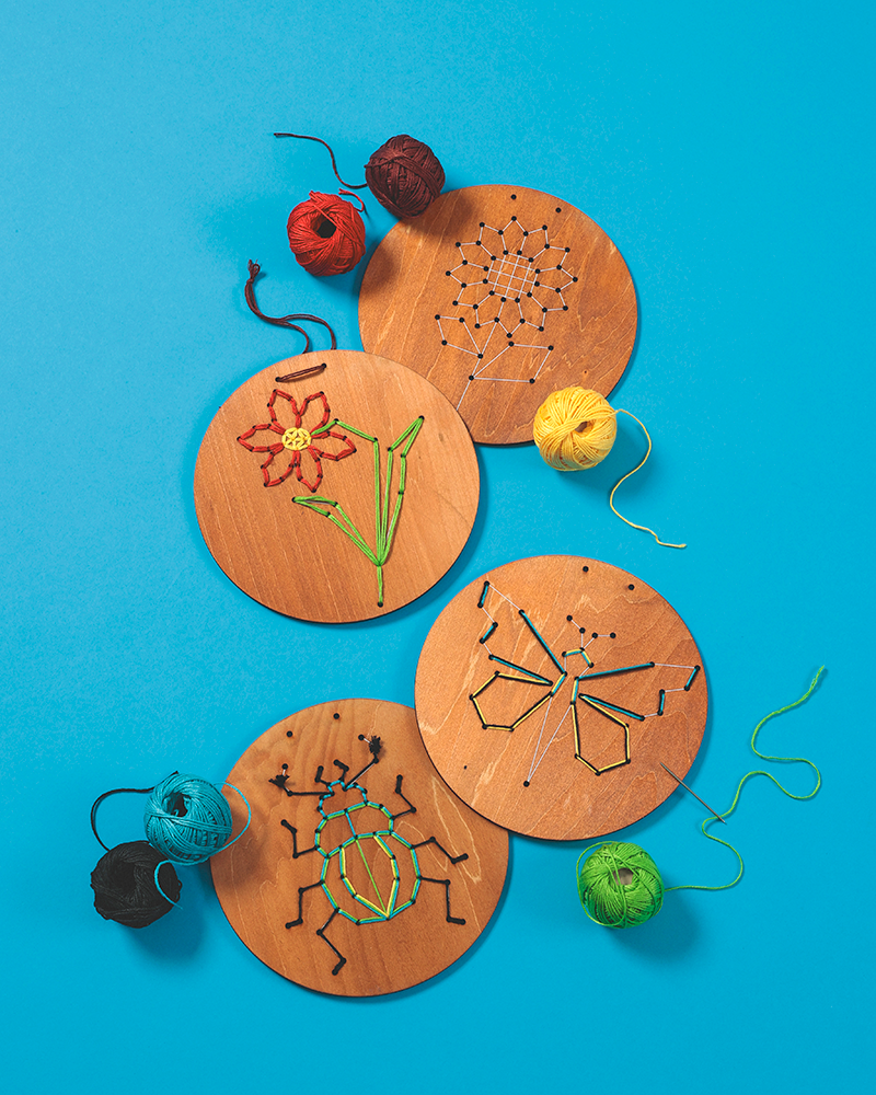 木製のまるいディスクに毛糸でステッチし、ウォールアートを作るキット。布よりも扱いやすく穴やラインが施されているので初めてのソーイングにもおすすめ。昆虫と植物の2種。ウォールアートステッチ各2,860円