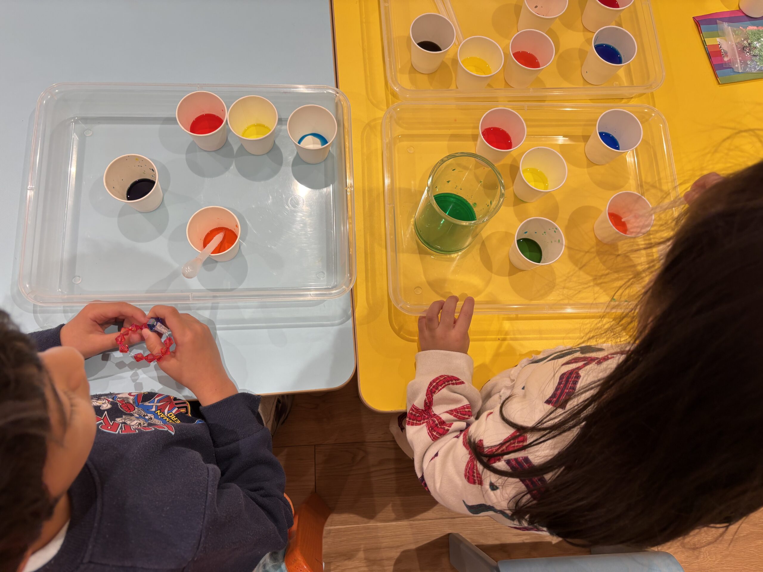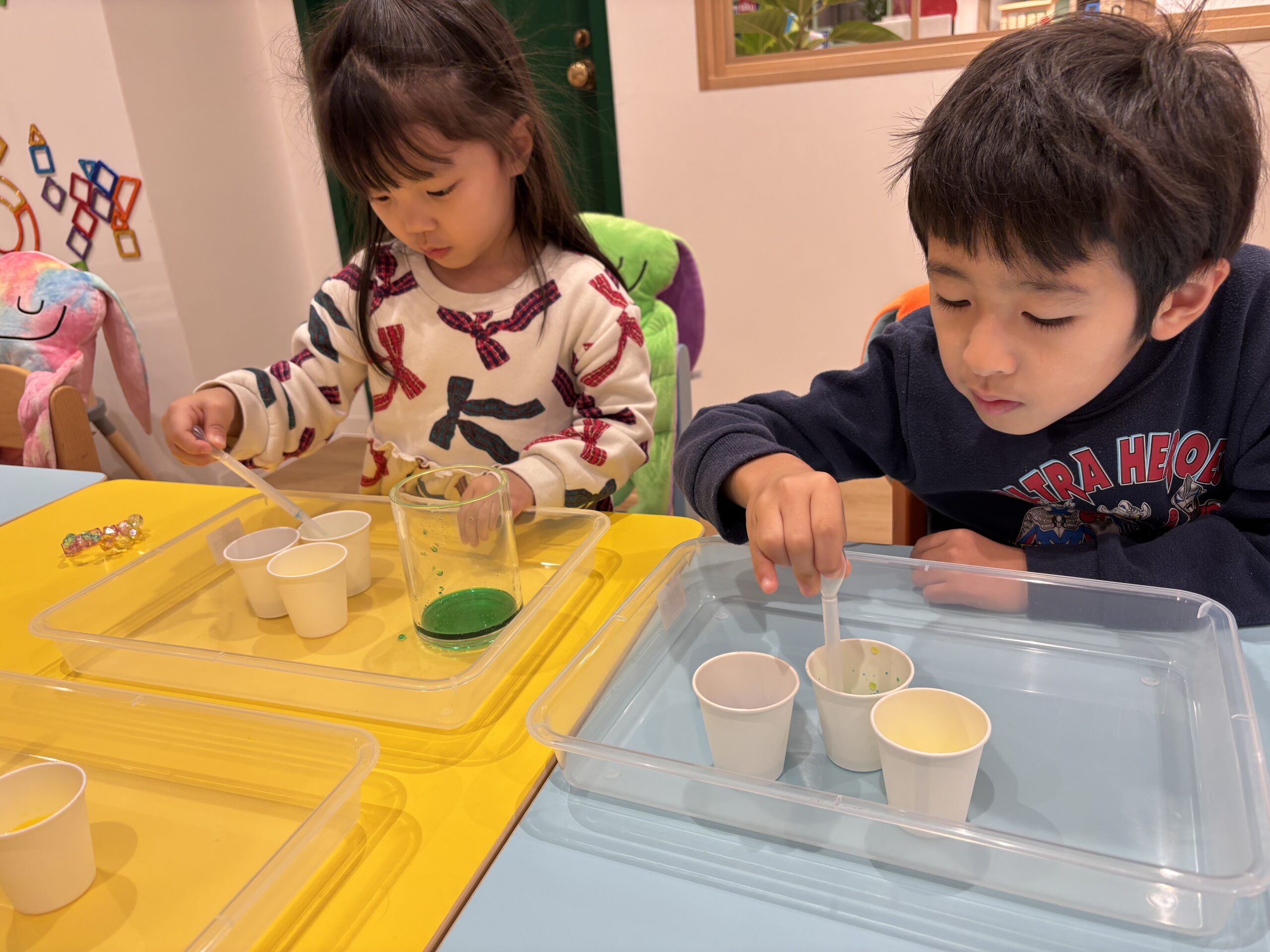 この日のテーマは「色」。色水を使って色の構成を実験します。