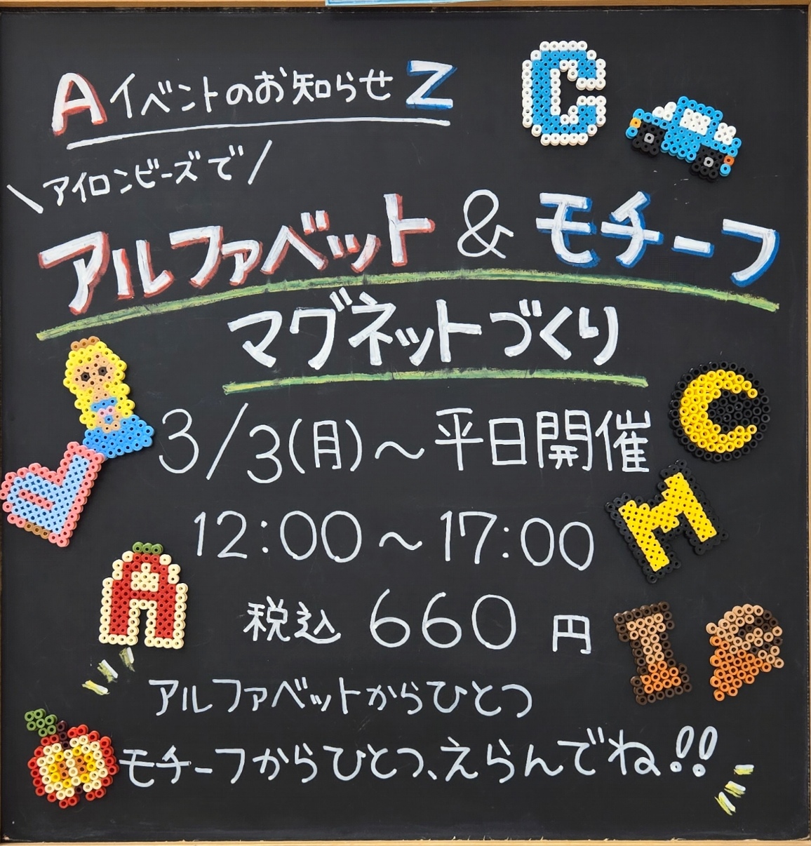 ご好評につき2月から引き続き、アイロンビーズでアルファベットとモチーフ作りのイベントを開催!