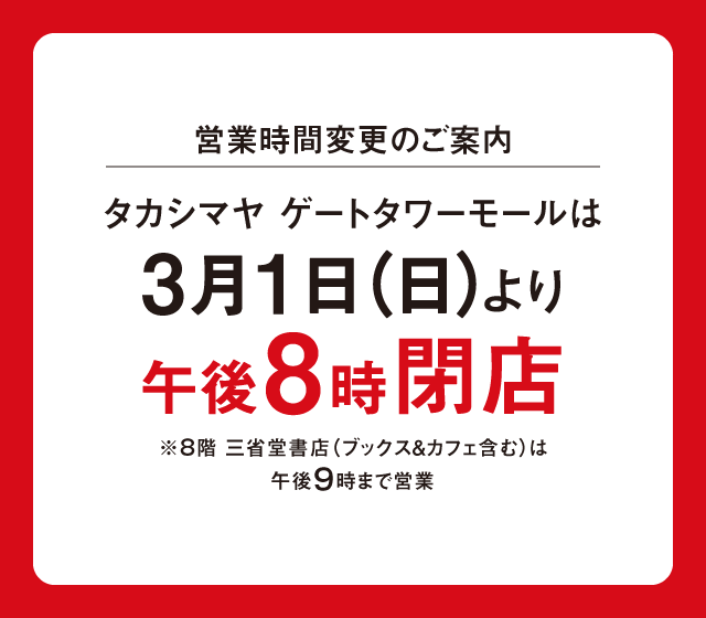 2026年3月1日(日)よりタカシマヤゲートタワーモールの営業時間を下記の通り変更いたします。