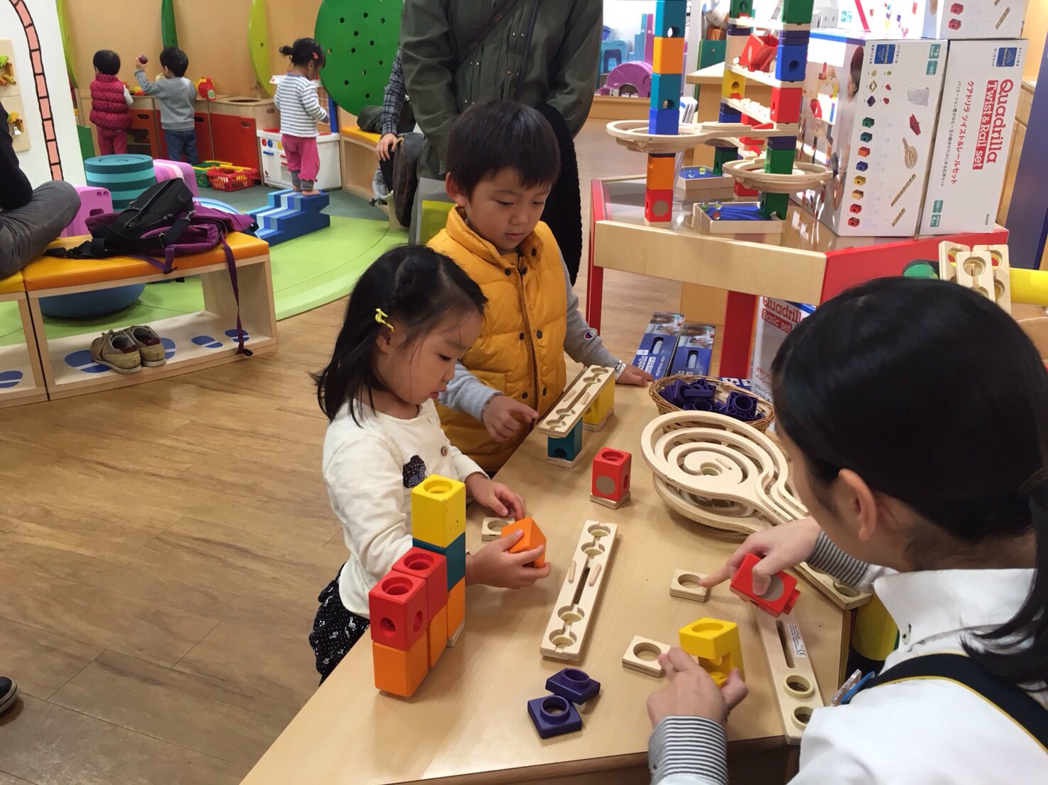 ビー玉を転がすコースを作る「クアドリラ」。下から積み上げていき、試行錯誤しながら組み立てます。構造的に考える力を育みます♪