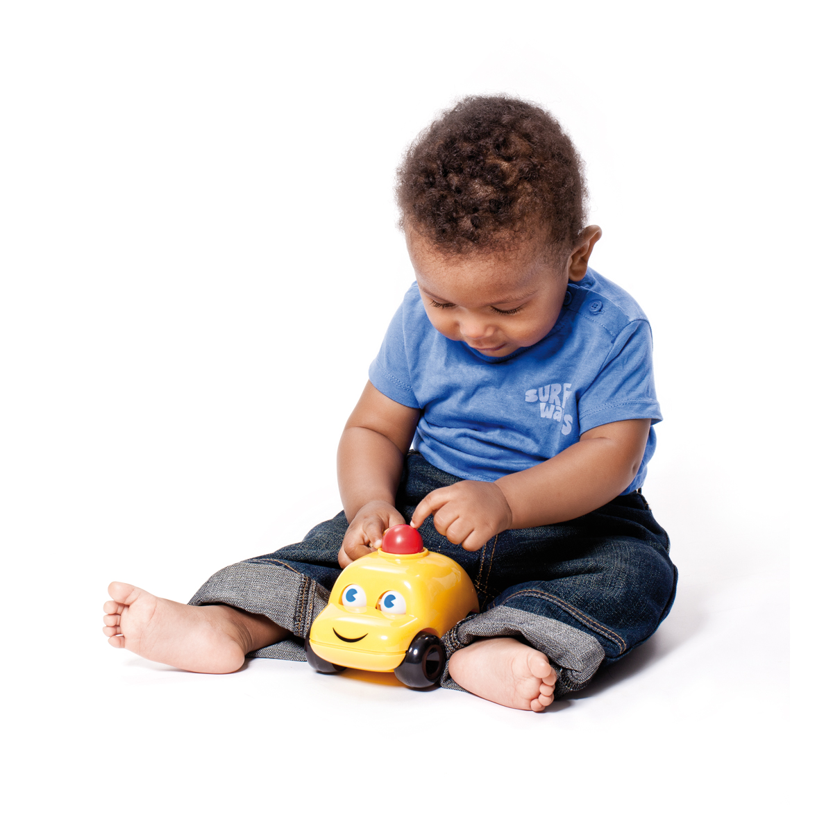おすわりの姿勢なら頭の赤いボタンを手のひらで押せるので、押すごとに「プップー」とクラクションが鳴る反応を楽しむことができますよ。