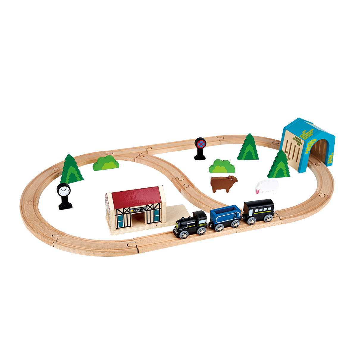 ヨーロッパの山岳地方の農村をイメージしたセット。ヨーロッパ式の電車に針葉樹やひつじ・牛も入っています。