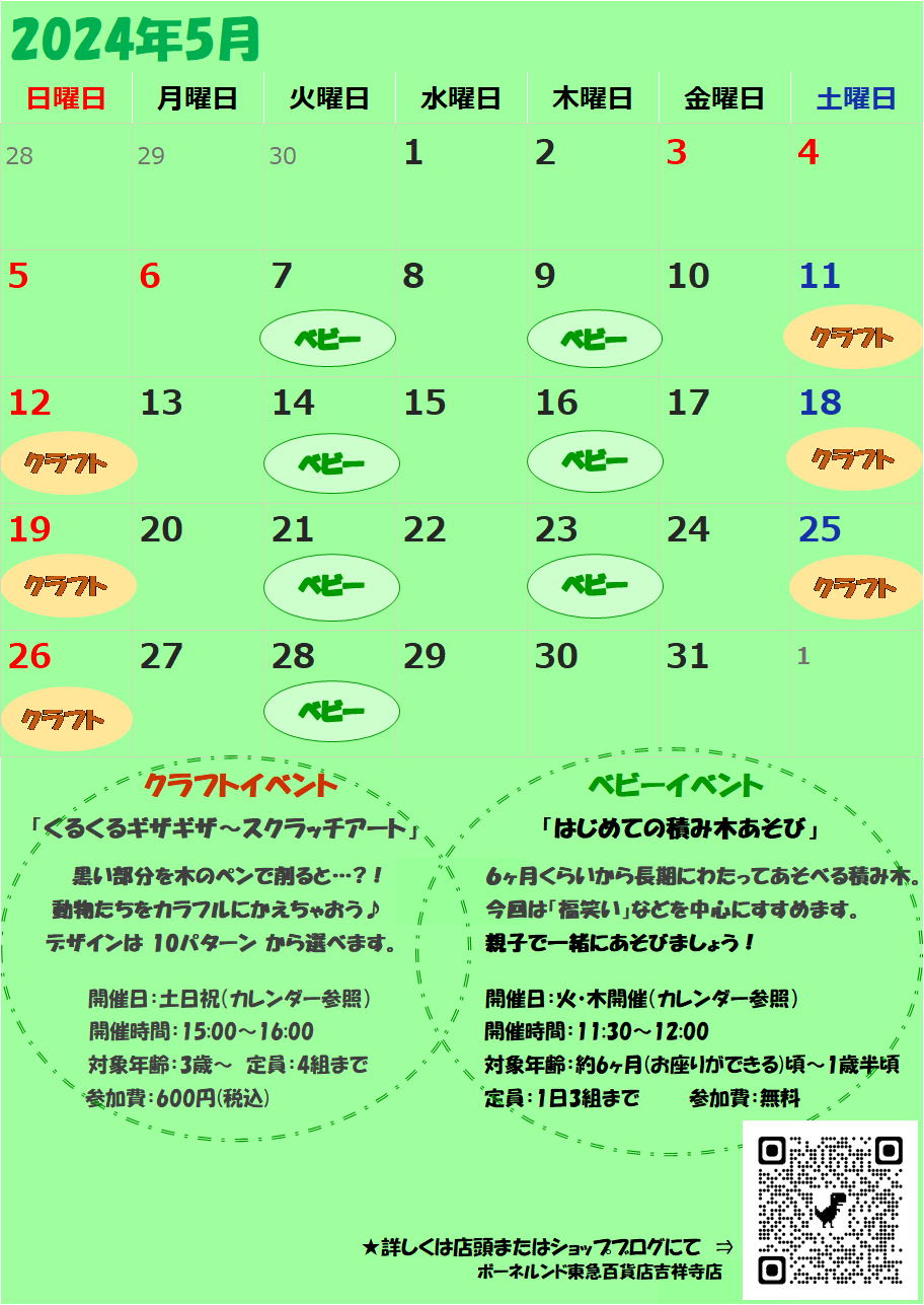 みなさんこんにちは。 新緑がまぶしい季節になりました。 さわやかで気持ちの良いこの季節、 思いっきり遊びたいですね。 5月のイベントのお知らせです。 【ベビーイベント】 はじめての積み木遊び 木のぬくもりが心地良い肌ざわりの積み木。 1歳前後のお子様から、小学生低学年位まで 長い期間あそべます。今回はおすわりできる お子様から「福笑い」などであそびます。 開催日 :火・木開催 カレンダーをご覧ください。…続きを読む