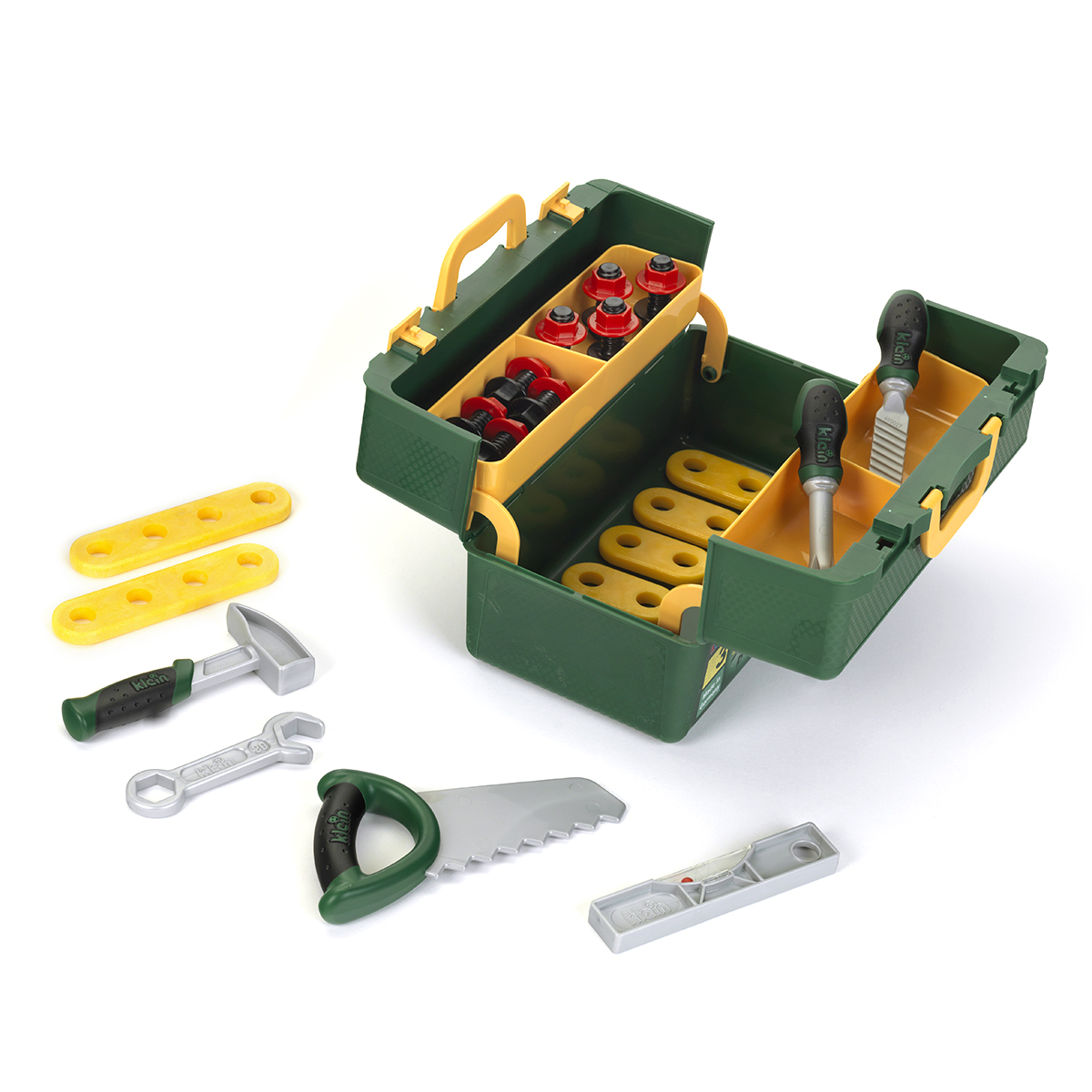 ハンマーやのこぎり、水平器などの基本的な工具が入った工具箱。