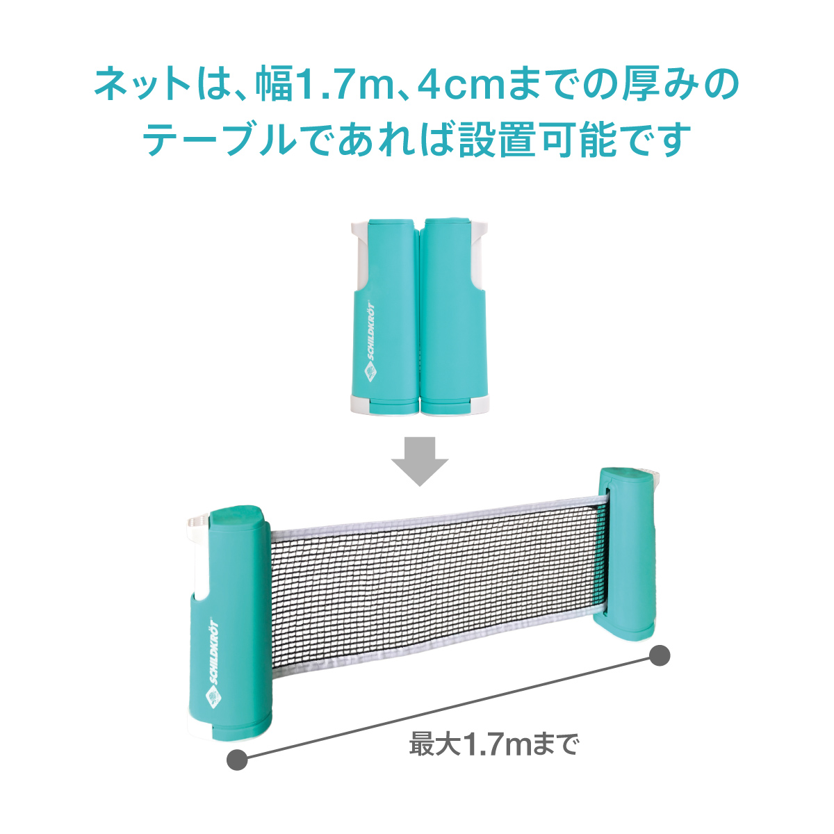 伸縮式のネットは、最大幅170cm、厚さ4cmまでならどんなテーブルも挟め、おうちのダイニングテーブル、公園やキャンプ場のピクニックテーブルにも挟んで使えます。また、ロール構造でネットはコンパクトに収納ができ便利です。