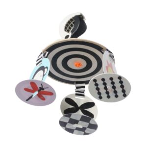 生まれてすぐの赤ちゃんは、「顔」や「目」に似たパターンを好んで見ることがわかっています。コントラストの強い同心円(的のような模様)もそのひとつです。赤ちゃんが「じっと見つめる」「焦点を合わせる」「距離感をつかむ」といった大切な力を育むため回ったり音が鳴ったりしない仕様。じっと見たり、あれ?と表情が変わったり、手足をバタバタ動かしたりする様子は「見えているよ!」というサインです。