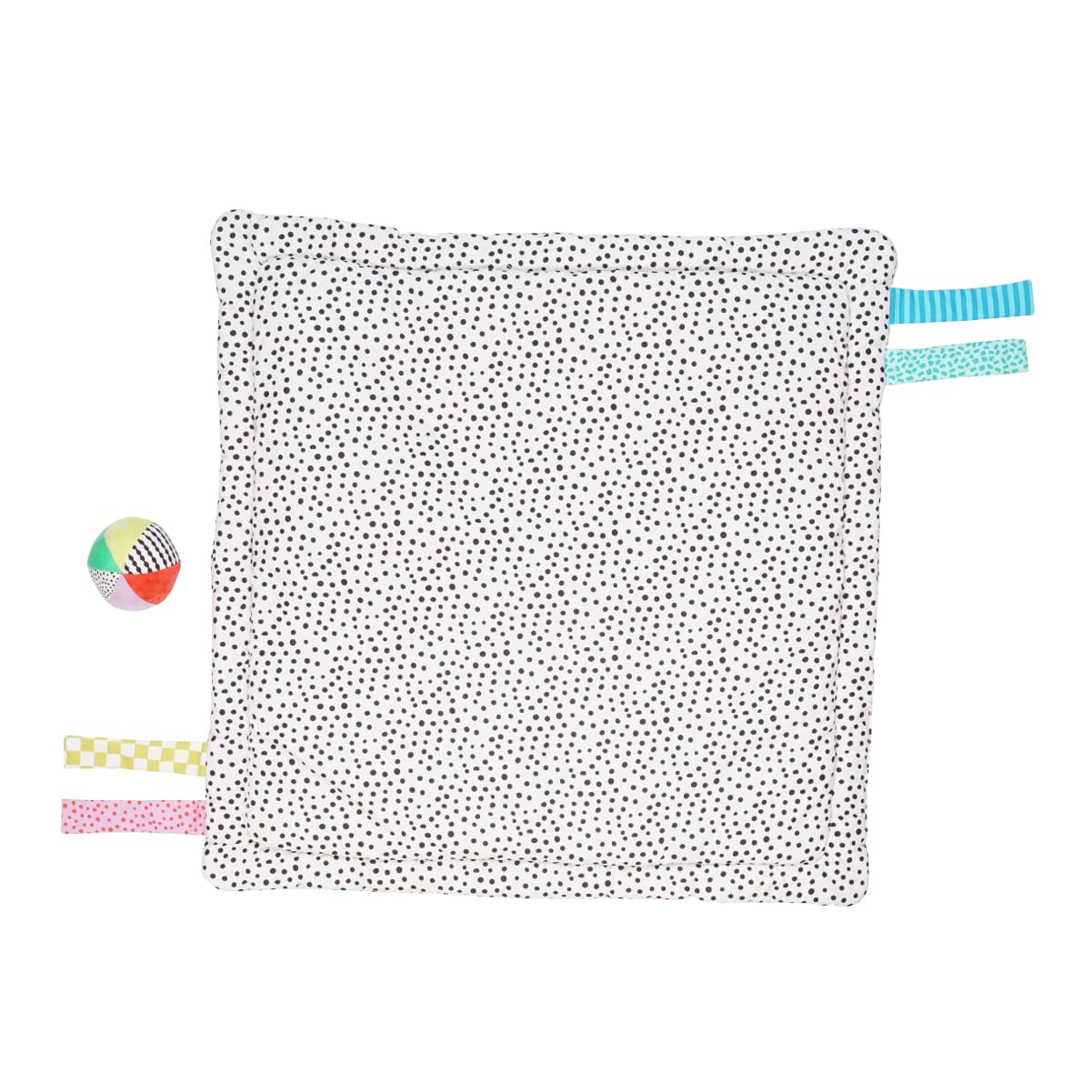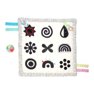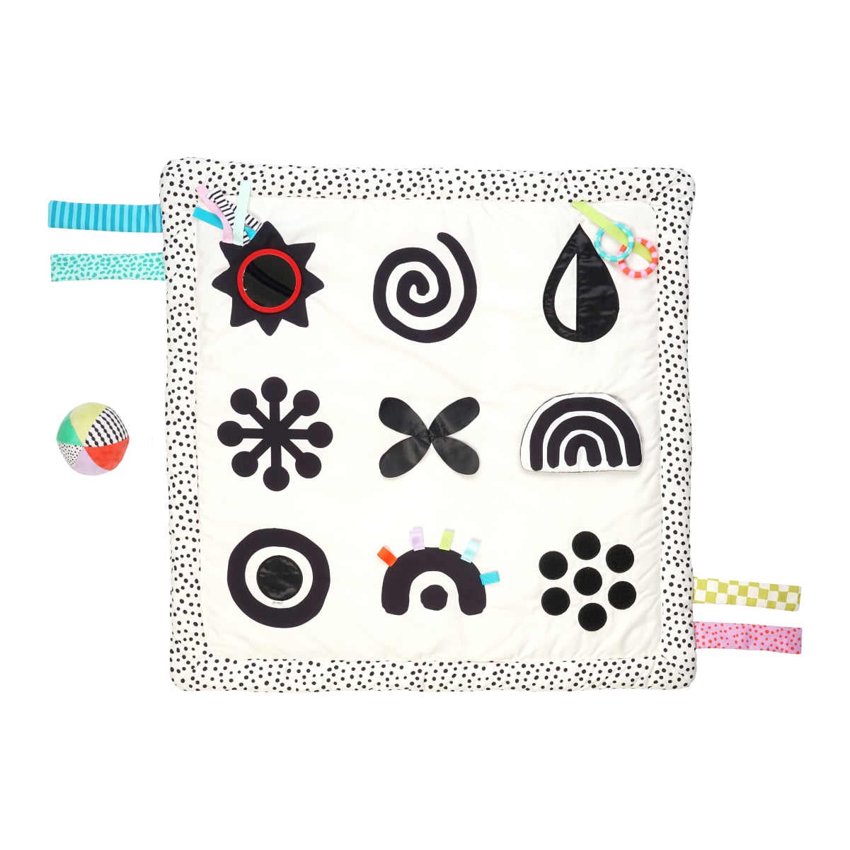 白黒のはっきりした図柄を寝転びながら間近で見ることができます。リングで音を鳴らし左右に動かす追視あそびでグラグラしていた首も少しずつ安定してきます。取り外しができる鏡をのぞき込んだり、パリパリする部分を触ったり。ふかふかとした素材で、 寝返りやずりばいやはいはい、おすわりや伝い歩きの頃の転倒防止用マットとしてもぴったり。