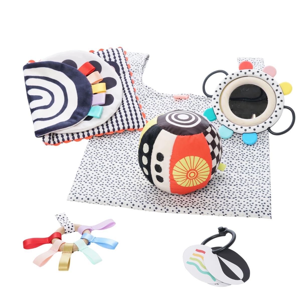 赤ちゃんに「見える」喜びと、五感の刺激をたっぷり使ったあそびを届ける、新生児期からすぐに使えるギフトセットです。