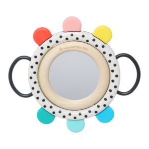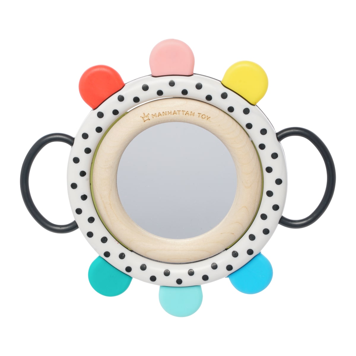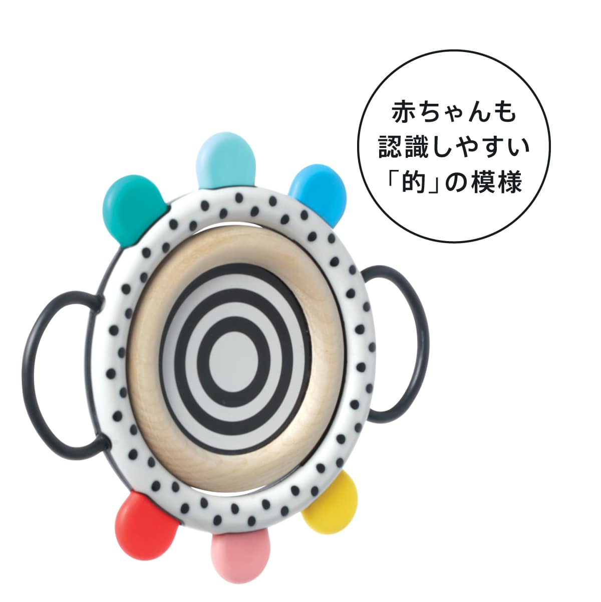 カシャカシャと鳴る音や、割れない安全な鏡、手のひらからの感触を楽しみながら、赤ちゃんの好奇心を刺激します。