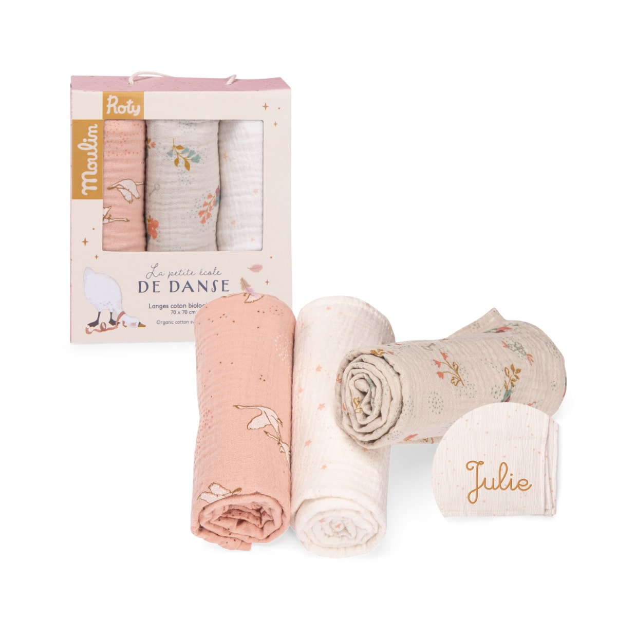 70cm×70cmの少し小ぶりなスワドルセットは、持ち運ぶのにもぴったりのサイズ。よだれや汗をふく日常のお世話から防寒、日除けにも大活躍。洗い替えも含めた3枚セット。