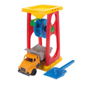 ミニスコップ・荷台付きトラック・サンドミル(砂や水で中間の水車がまわります)がセットになっています。上部のレバーをスライドさせると、上から流した水・砂の落ちる量を3段階に調節できます。ごっこ遊びも楽しめ、想像力の幅も広がります。